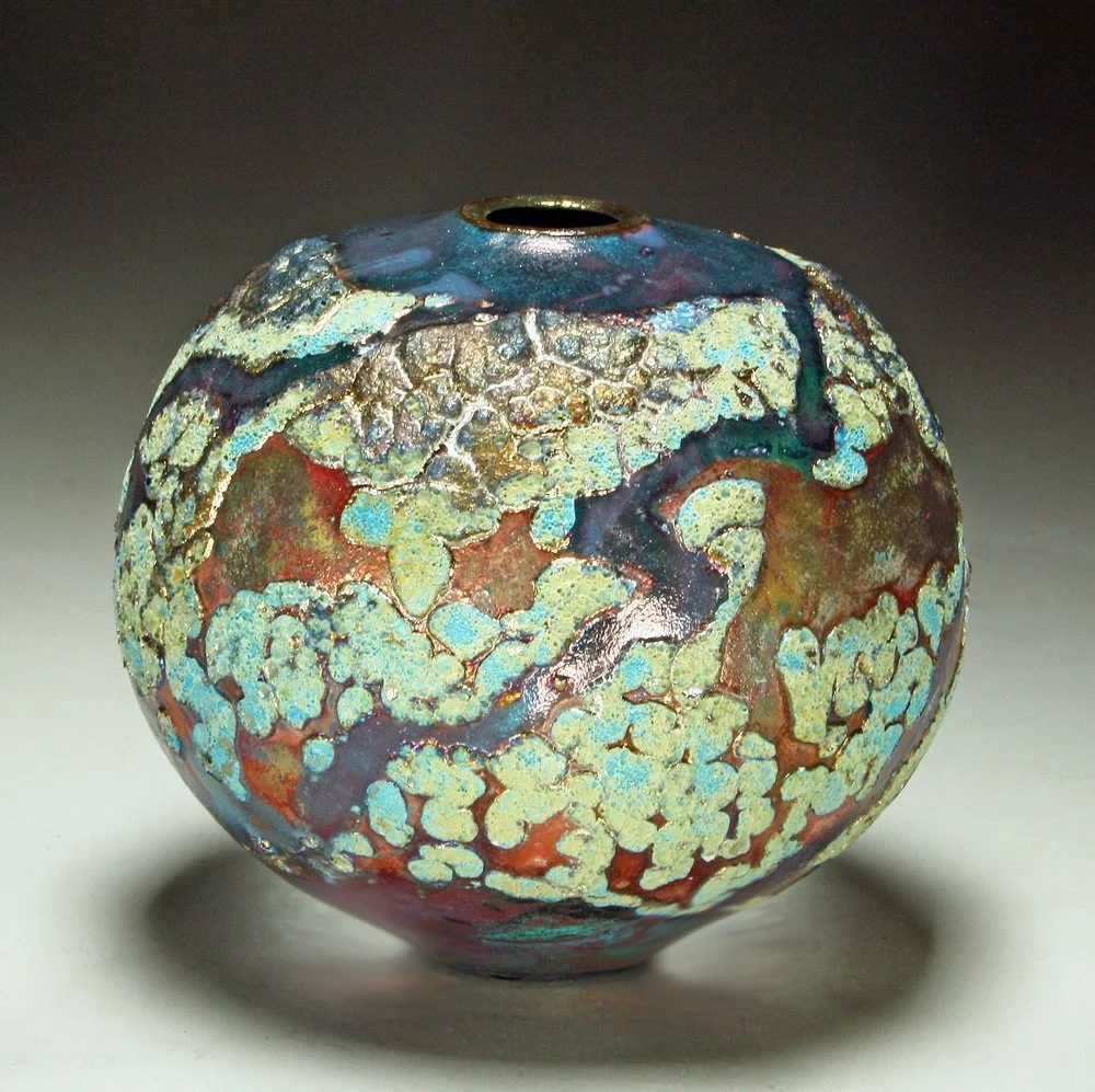 The technique that I use is a unique and magical form of pottery. American raku pottery dates to 1960 when a famous ceramic artist named Paul Soldner discovered the exciting results possible when a pot was placed in combustible materials when removed from the kiln. It differentiates from Japanese raku in that it focuses primarily on this post firing reduction. While both techniques embody the spirit of spontaneity, removing a piece from the kiln and letting it smolder in a combustible makes American raku pottery all the more exciting and unpredictable. There is nothing quite like pulling a glowing hot vessel or sculpture from the kiln and placing it in a metal container that holds combustibles. As soon as you cover the container and smother the flames, a reduction chamber is created and it is at this moment that something incredible happens... When I open the reduction chamber about 30 minutes later, it’s like being a kid at Christmas as I never know for sure what to expect. I was hooked on this process nearly 40 years ago and have fired using raku exclusively ever since. During that time I estimate I’ve fired over 7000 raku kilns!